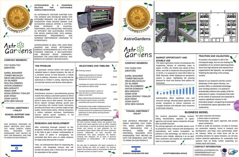 Каждый год в рамках этой программы проходит международный конкурс, предоставляющий школьникам уникальную платформу для демонстрации своих стартапов в сфере космоса. В этом году Израиль представляли 5 команд, вошедших в финал конкурса, в том числе команда учащихся из школы "Атид" им. Иоанны Жаботинской, чей научно-предпринимательский космический проект также прошел в финал. Они разработали исследовательскую капсулу (AstroGardens) для выращивания кактусов и других растений в космических условиях.