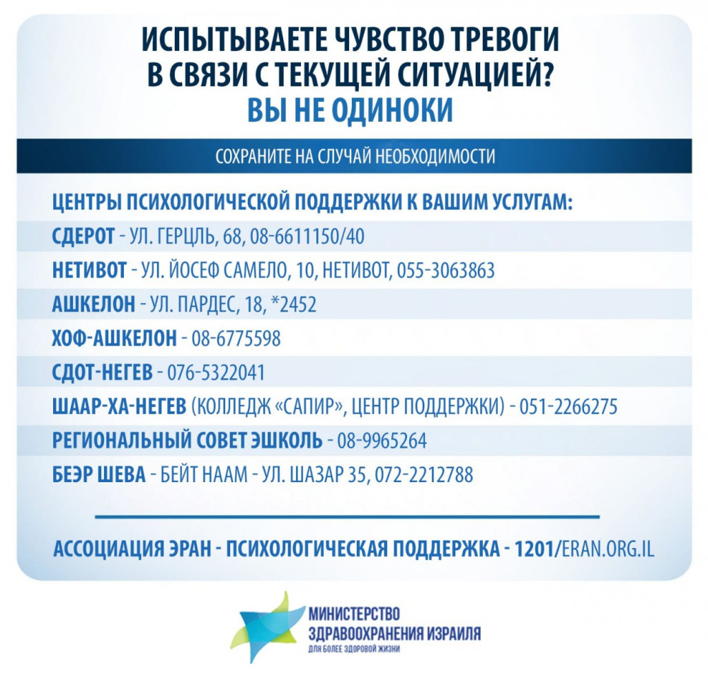 Кроме того, центры поддержки на юге страны, находящиеся в ведении министерства здравоохранения и других министерств, готовы оказать психологическую поддержку людям, испытывающим тревожность и стресс в связи с боевыми действиями.