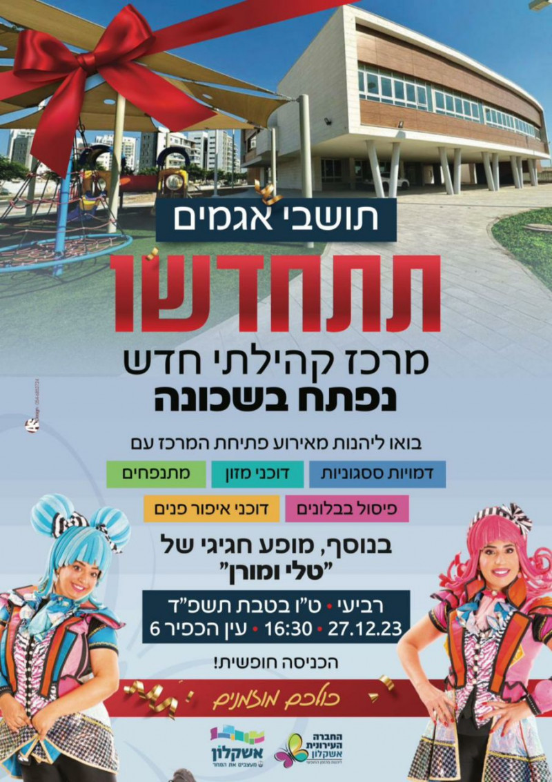 В районе появляется новый центр: муниципалитет Ашкелона через муниципальную компанию запускает на этой неделе в среду 27 декабря новый общественный центр в районе Агамим.