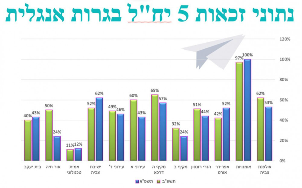 По английским предметам вы также можете увидеть плоды инвестиций: 100% учащихся получают доступ к 4-5 предметам в Школе искусств, рост более чем на 25% в Педагогической школе Ор Хая и в среднем более 50 % всех студентов Ашкелона, посещающих 4-5 учебных модулей по этому предмету.
