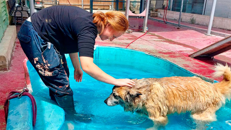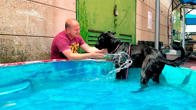 Из-за сильной жары муниципальный питомник Ашкелона позаботился о четвероногих и с утра наполнил бассейн в питомнике холодной водой для удовольствия находящихся там собак.\