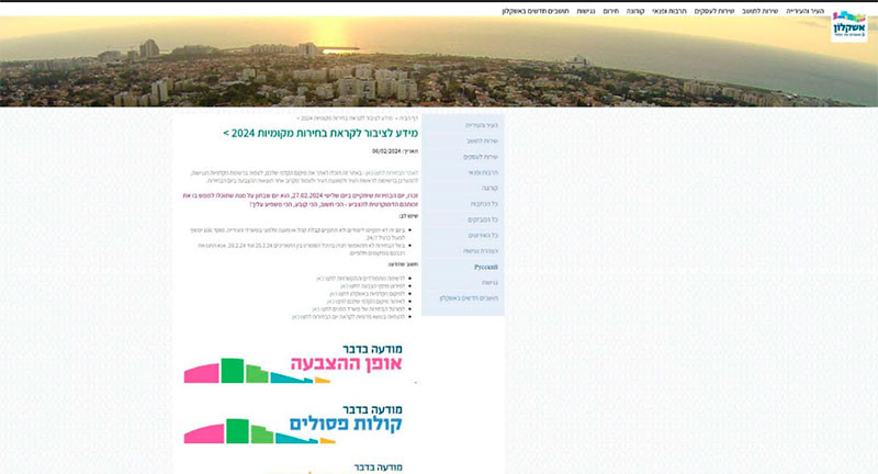 В рамках подготовки к муниципальным выборам, которые состоятся в ближайший вторник 27 февраля 2024 года, муниципалитет Ашкелона создал контент, где жители могут найти свои избирательные участки, просмотреть список доступных избирательных участков, ознакомиться со списками претендентов на пост мэра и в городской совет и внимательно следить за результатами голосования в день выборов.