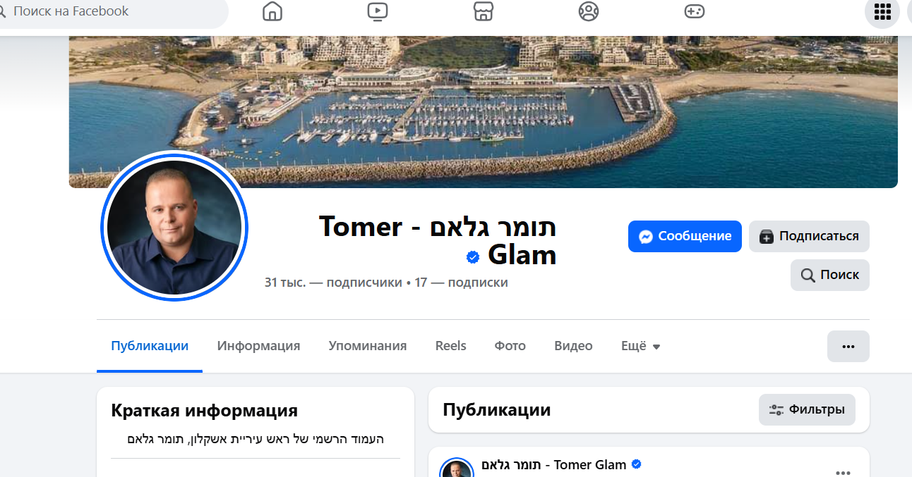 В последние дни мы обнаружили в социальной сети Facebook фиктивный профиль человека, выдающего себя за мэра Томера Глама и даже называющего себя Томером Гламом, приложив к нему фотографию мэра.