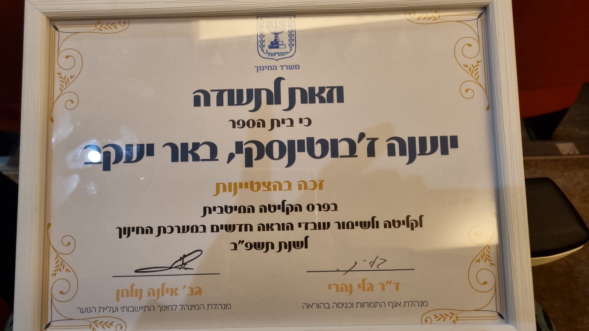 На прошлой неделе (в четверг вечером), Минпрос провел церемонию вручения грамот школам - лауреатам премии за особый вклад в интеграцию новых учителей в систему образования. В категории "оптимальная интеграция учителей-репатриантов" премия была вручена школе "Атид" им. Иоанны Жаботинской.