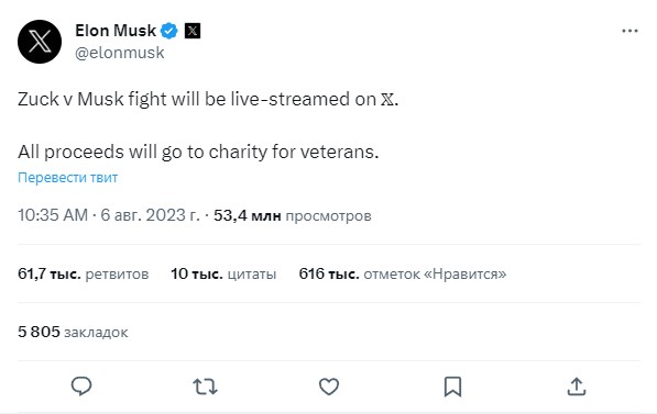 Илон Маск отметил, что трансляция поединка между ним и Цукербергом состоится на платформе X, при этом все средства от трансляции планируют отдать на благотворительность для ветеранов.