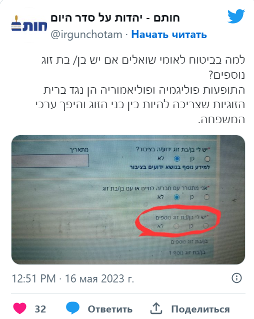 В Израиле фурор вызвал вопрос в анкете Битуах Леуми: есть ли у вас дополнительный супруг/супруга