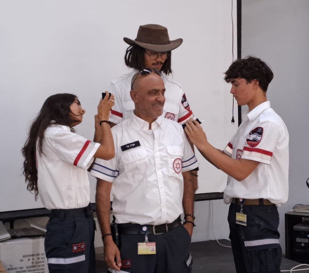 Вчера (воскресенье) состоялась церемония окончания курсов первой помощи для молодежи с плато Негев. В ходе церемонии координатору волонтеров и акций МДА в регионе старшему медику Орену Бару было присвоено погонное звание. Трое его детей - Ярин, Офир и Рой, которые сами являются волонтерами МДА, вручили ему звания и всем показали. дух волонтерства, который пронизывает их в садах.