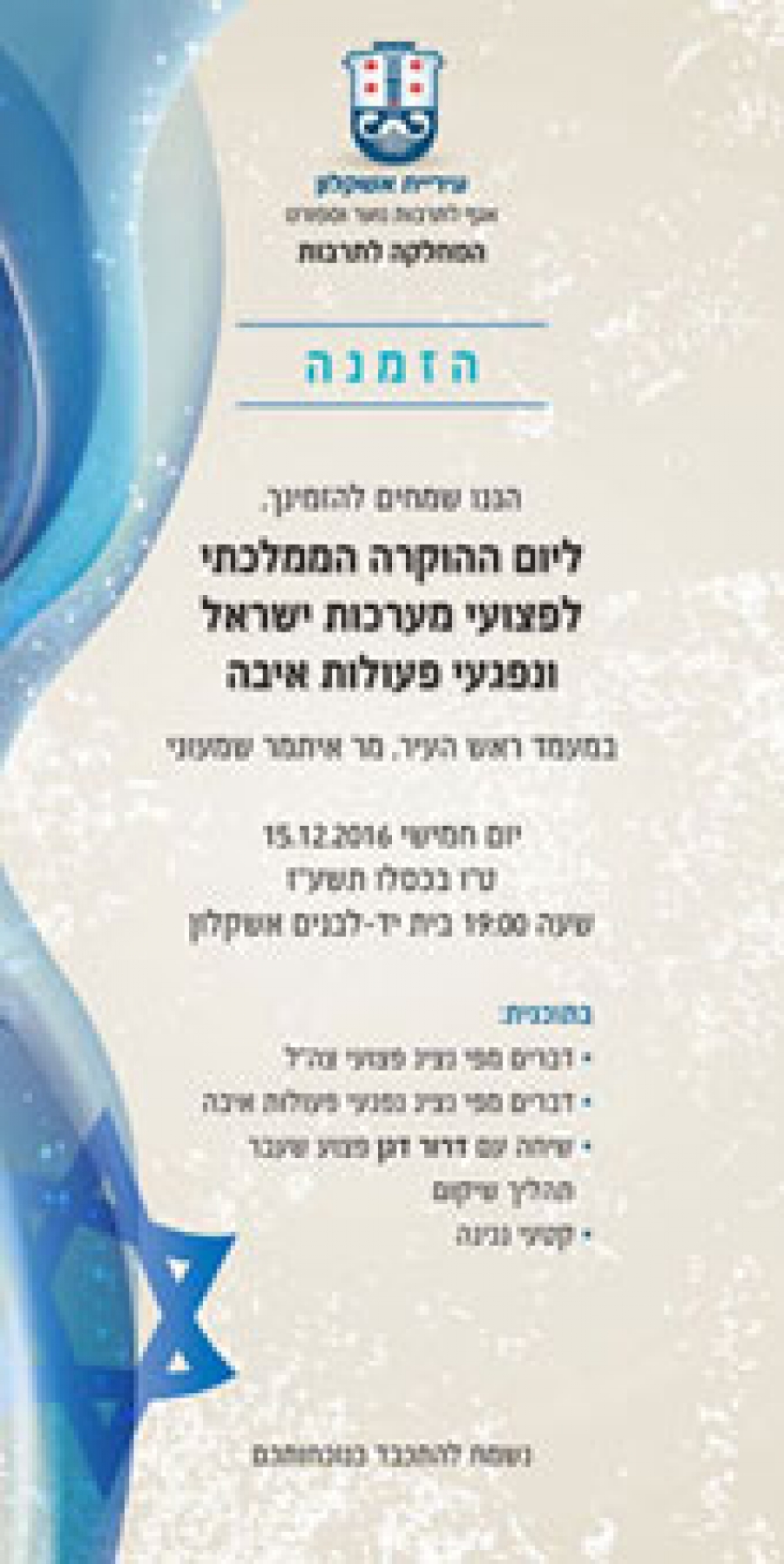 Около 320 раненых в военных действиях и жертв террора, жителей Ашкелона, получили приглашения на уникальный и захватывающий вечер чествования. Кроме того, эти люди посетят городские школы и расскажут свою личную историю молодежи.