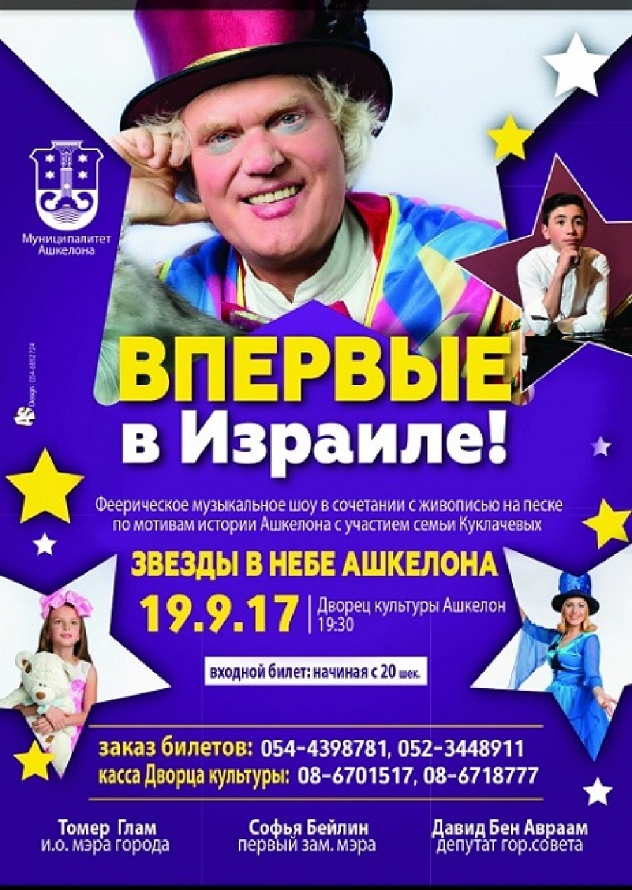 Автор сценария – профессор еврейской истории и этнографии Владимир Сандлер, автор исторической монографии «Миры и войны Ашкелона». Режиссёр-постановщик шоу - житель Ашкелона, гражданин Израиля и России, народный артист России, клоун мирового класса, автор воспитательной программы «Школа доброты» - Юрий Куклачев. Место проведения – ашкелонский Дворец культуры. Главный участник шоу – Катя Куклачёва – признанный в мире художник, создающая картины песком. Музыкальную часть шоу представляет молодой израильский пианист-виртуоз Бен Якубов. В представлении участвуют певцы и танцоры, среди которых известный в Израиле, России и других странах солист балета - Владимир Куклачёв (в 2006 году занял призовое место в конкурсе израильского телевидения «Кохав ноляд»). Кроме того, в шоу выступят артисты балетной студии «Престиж» под руководством Василия Бушина.