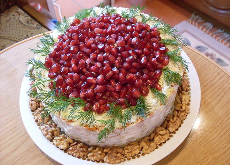 Ингредиенты и приготовление: 1. Лук (мелко порезать кубиками и обдать кипятком); 2. варёный картофель (кубиками); 3. куриная грудка (желательно копчёная или гриль); 4. грецкие орехи (мелко натереть на тёрке или размельчить в блендере); 5. морковь (варёная, порезать кубиками); 6. яйцо (размять или потереть на крупной тёрке); 7. сыр. Каждый слой смазываем майонезом, но не толстым слоем. Сверху положить зёрна граната. Желательно дать салату постоять хотя бы час, чтобы пропитался майонезом.